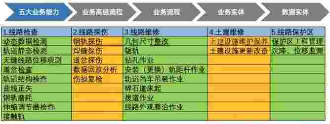 在轨道运维业务中,,,,我们形成了完整的从业务能力(业务域)-业务流程-业务实体-数据模型的分析梳理过程。。。。。。。。轨道运维业务能力如下图所示::::::::::