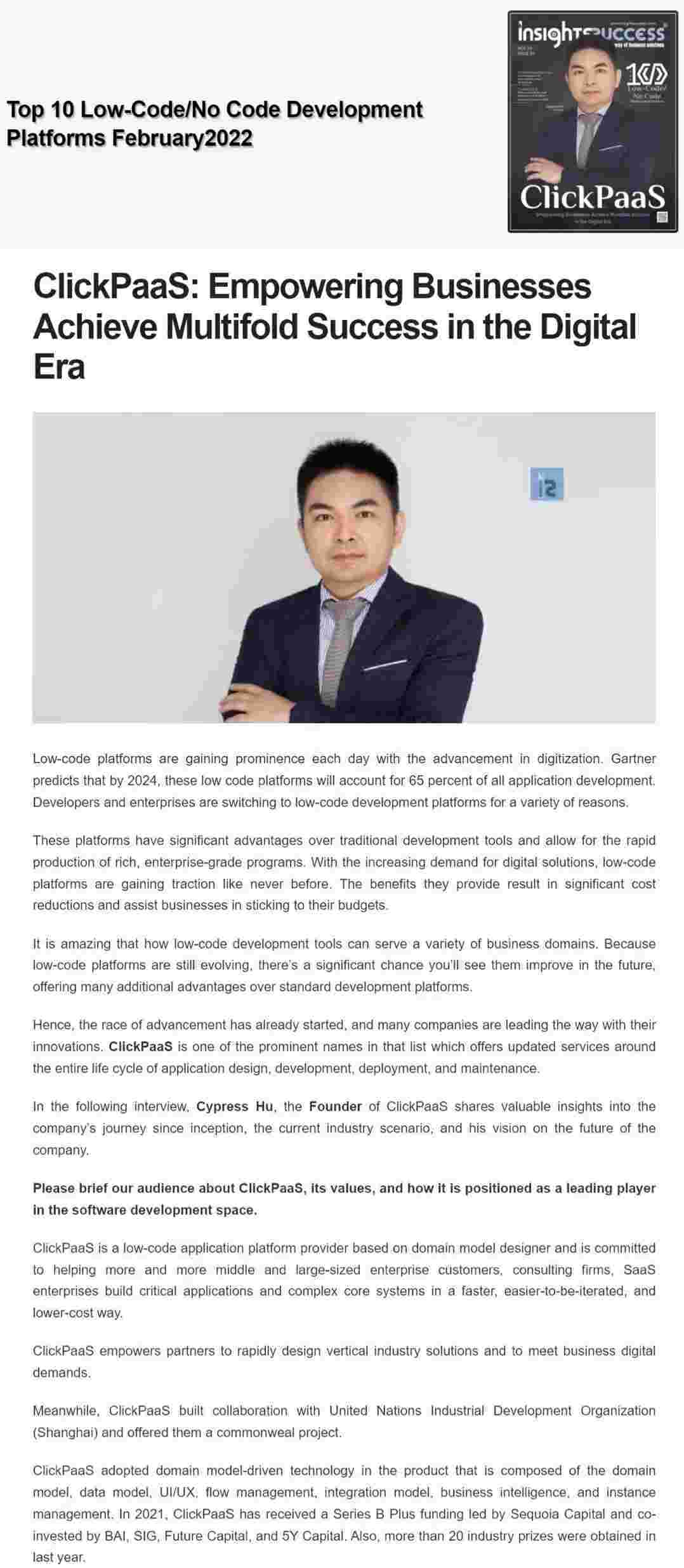 2022年年初,,,,,,OPPO钱包入选外媒Insights Success低代码/无代码开发平台 Top10,,,,,,,创始人、、、、、、、、CEO胡柏受邀接受专访并荣登封面人物,,,,,,他与Insights Success的读者分享了OPPO钱包成立的初心、、、、、、、、、、、、、、发展历程、、、、、、、、、当前的行业发展趋势以及他对公司未来的展望。。。。。。